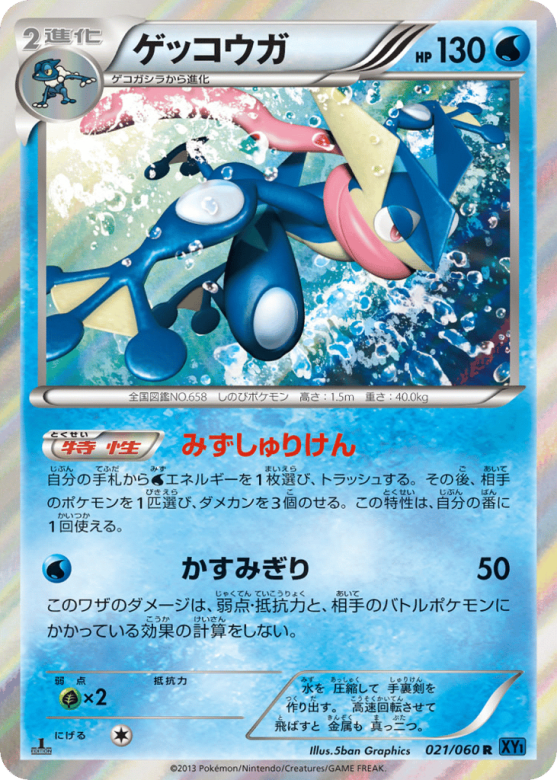 自分の手札からWaterエネルギーを1枚選び、トラッシュする。その後、相手のポケモンを1匹選び、ダメカンを3個のせる。この特性は、自分の番に1回使える。