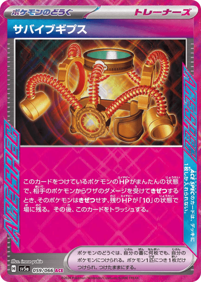 このカードをつけているポケモンのHPがまんたんの状態で、相手のポケモンからワザのダメージを受けてきぜつするとき、そのポケモンはきぜつせず、残りHPが「10」の状態で場に残る。その後、このカードをトラッシュする。