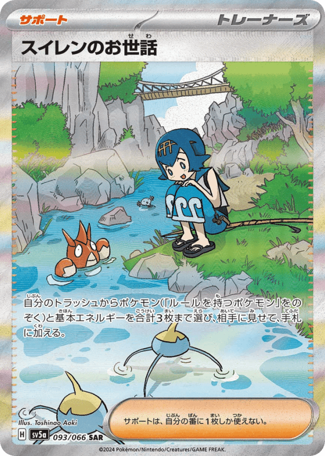 自分のトラッシュからポケモン(「ルールを持つポケモン」をのぞく)と基本エネルギーを合計3枚まで選び、相手に見せて、手札に加える。 サポートは、自分の番に1枚しか使えない。