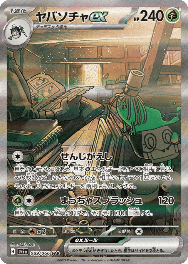 自分のトラッシュにある「基本Grassエネルギー」をすべて相手に見せ、その枚数×2個ぶんのダメカンを、相手のポケモン1匹にのせる。その後、見せたエネルギーを山札にもどして切る。