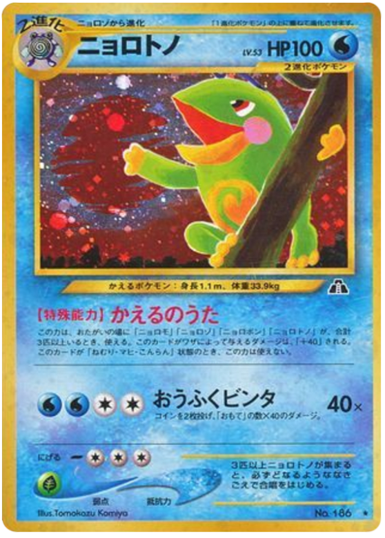 Whenever Politoed's attack damages the Defending Pokémon (after applying Weakness and Resistance), if there are more than 3 Poliwags, Poliwhirls, Poliwraths, and/or Politoeds in play (including your opponent's), that attack does 40 more damage (no matter how many heads you get). This power stops working while Politoed is Asleep, Confused, or Paralyzed.