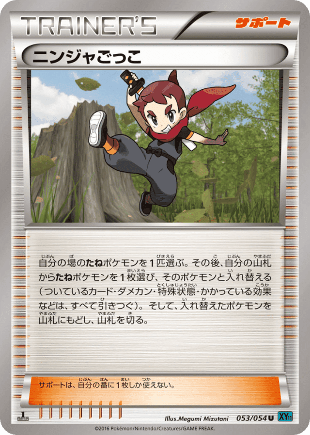 自分の場のたねポケモンを1匹選ぶ。その後、自分の山札からたねポケモンを1枚選び、そのポケモンと入れ替える(ついているカード・ダメカン・特殊状態・かかっている効果などは、すべて引きつぐ)。そして、入れ替えたポケモンを山札にもどし、山札を切る。 サポートは、自分の番に1枚しか使えない。
