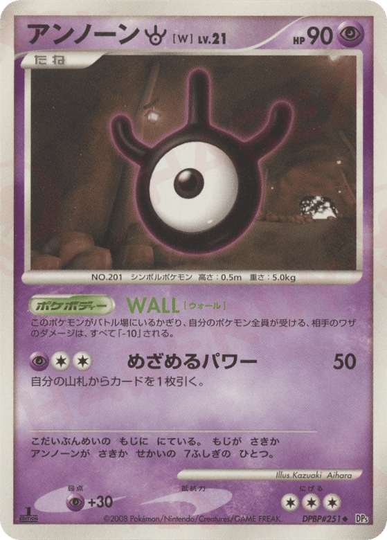 As long as Unown W is your Active Pokémon, any damage done to your Pokémon by an opponent's attack is reduced by 10 (after applying Weakness and Resistance).