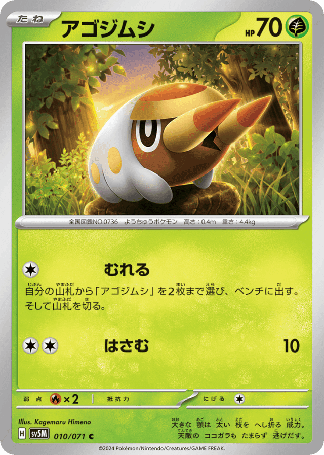 FlockCost: 1自分の山札から「アゴジムシ」を2枚まで選び、ベンチに出す。そして山札を切る。