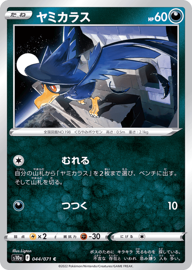 自分の山札から「ヤミカラス」を2枚まで選び、ベンチに出す。そして山札を切る。