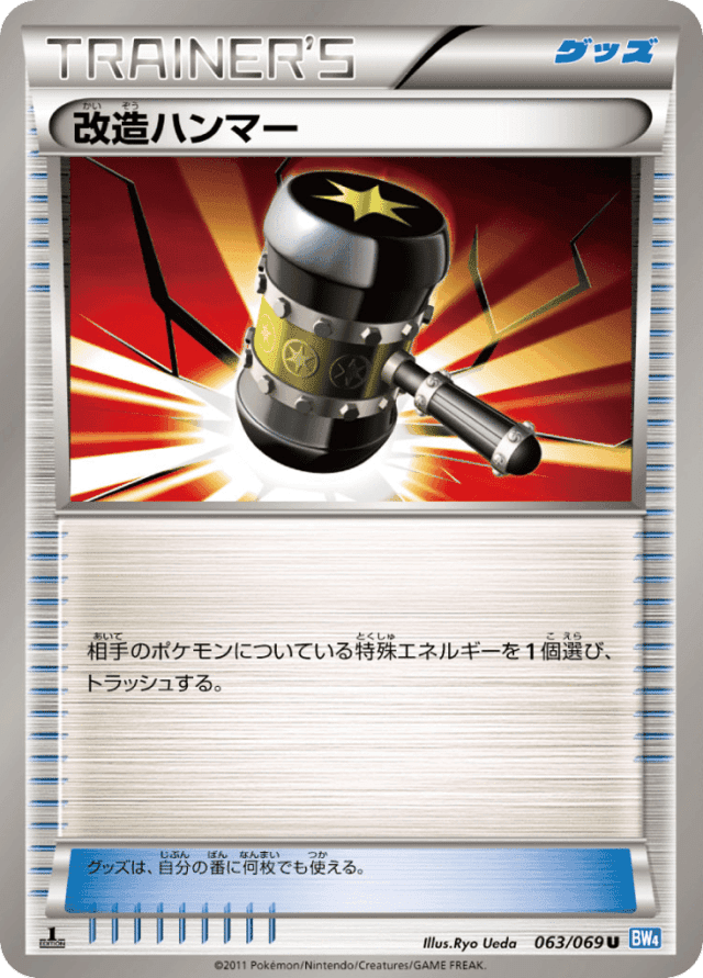 相手のポケモンについている特殊エネルギーを1個選び、トラッシュする。 グッズは、自分の番に何枚でも使える。