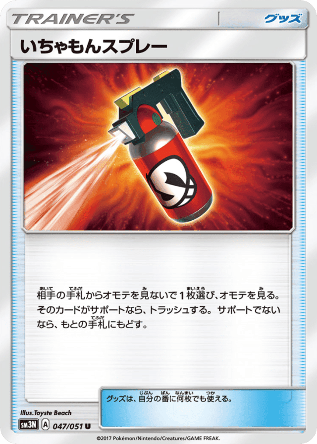 相手の手札からオモテを見ないで1枚選び、オモテを見る。そのカードがサポートなら、トラッシュする。サポートでないなら、もとの手札にもどす。 グッズは、自分の番に何枚でも使える。