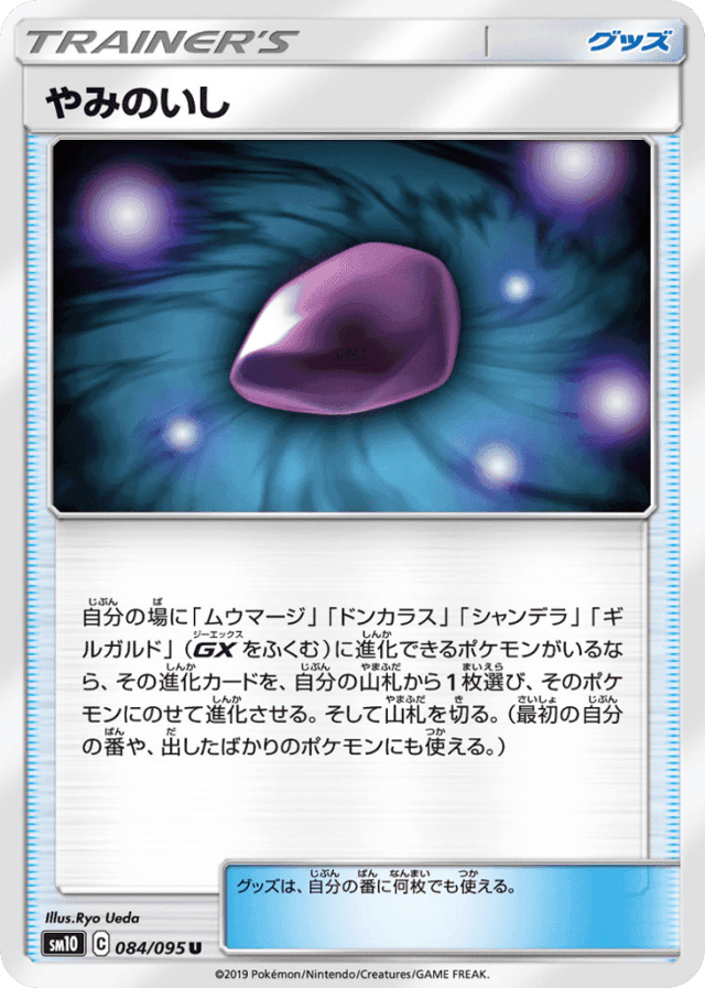 自分の場に「ムウマージ」「ドンカラス」「シャンデラ」「ギルガルド」(GXをふくむ)に進化できるポケモンがいるなら、その進化カードを、自分の山札から1枚選び、そのポケモンにのせて進化させる。そして山札を切る。(最初の自分の番や、出したばかりのポケモンにも使える。) グッズは、自分の番に何枚でも使える。