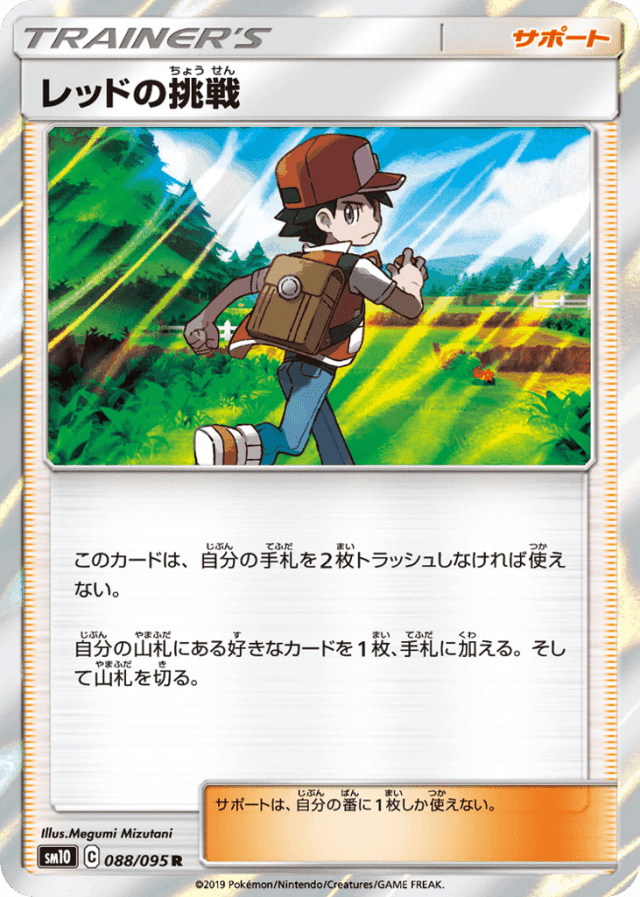 このカードは、自分の手札を2枚トラッシュしなければ使えない。 自分の山札にある好きなカードを1枚、手札に加える。そして山札を切る。 サポートは、自分の番に1枚しか使えない。