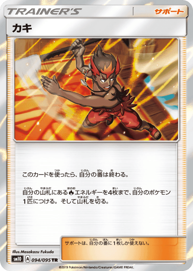 - このカードを使ったら、自分の番は終わる。 — 自分の山札にあるFireエネルギーを4枚まで、自分のポケモン1匹につける。そして山札を切る。 — サポートは、自分の番に1枚しか使えない。