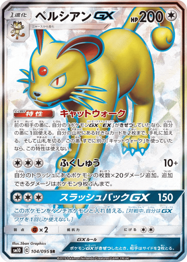 前の相手の番に、自分の「ポケモンGX・EX」がきぜつしていたなら、自分の番に1回使える。自分の山札にある好きなカードを2枚まで、手札に加える。そして山札を切る。この番、すでに別の「キャットウォーク」を使っていたなら、この特性は使えない。