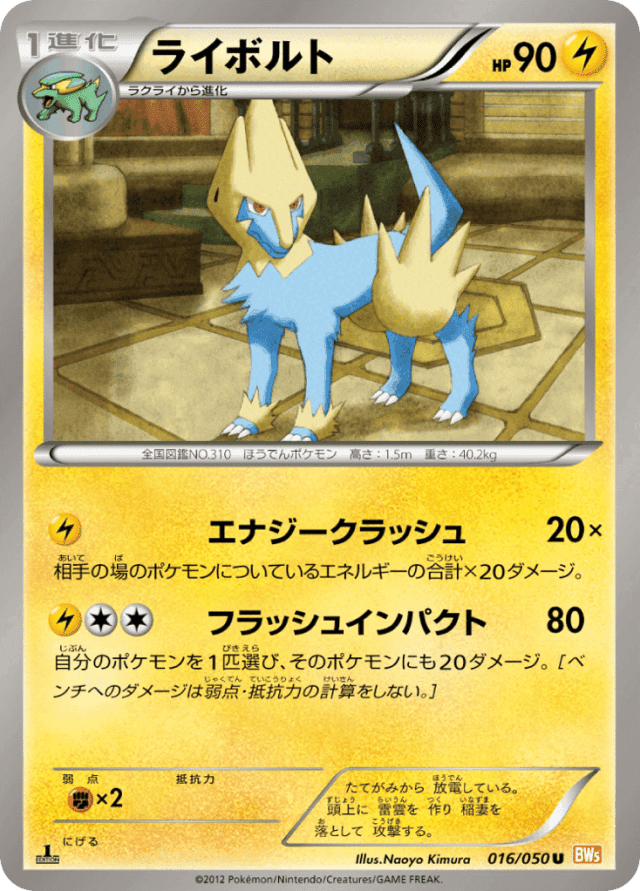 Flash Impact80Cost: 3自分のポケモンを1匹選び、そのポケモンにも20ダメージ。[ベンチへのダメージは弱点・抵抗力の計算をしない。]