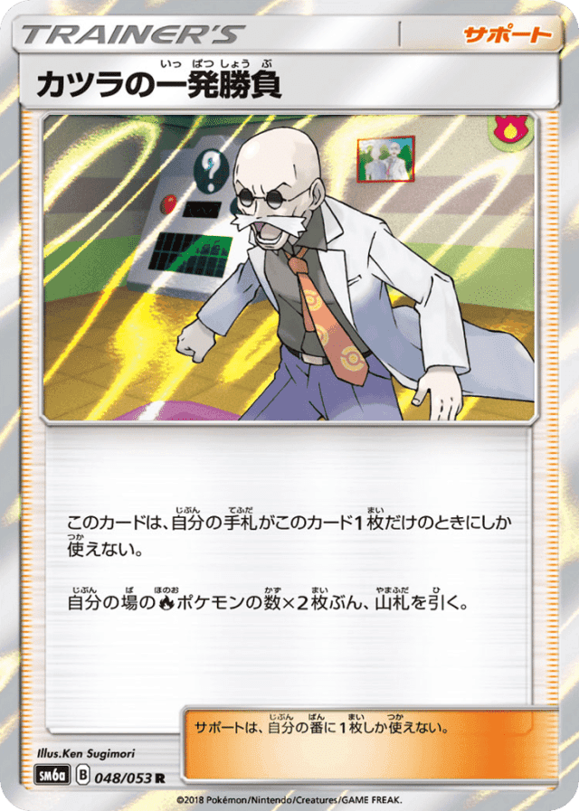 - このカードは、自分の手札がこのカード1枚だけのときにしか使えない。 — 自分の場のFireポケモンの数×2枚ぶん、山札を引く。 — サポートは、自分の番に1枚しか使えない。