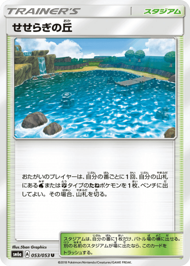 - おたがいのプレイヤーは、自分の番ごとに1回、自分の山札にあるWaterタイプのたねポケモンを1枚、ベンチに出してよい。その場合、山札を切る。 — スタジアムは、自分の番に1枚だけ、バトル場の横に出せる。別の名前のスタジアムが場に出たなら、このカードをトラッシュする。