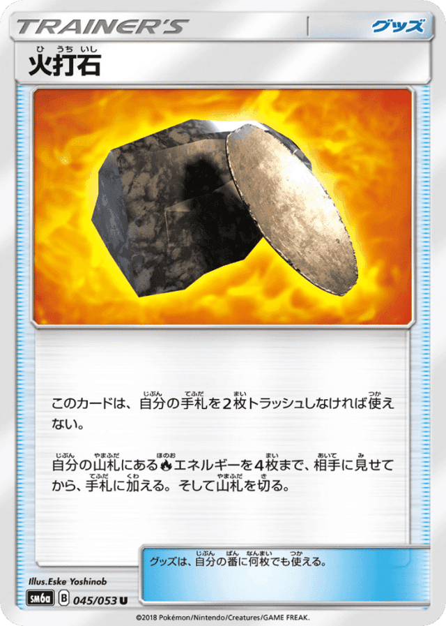 このカードは、自分の手札を2枚トラッシュしなければ使えない。 自分の山札にあるFireエネルギーを4枚まで、相手に見せてから、手札に加える。そして山札を切る。 グッズは、自分の番に何枚でも使える。