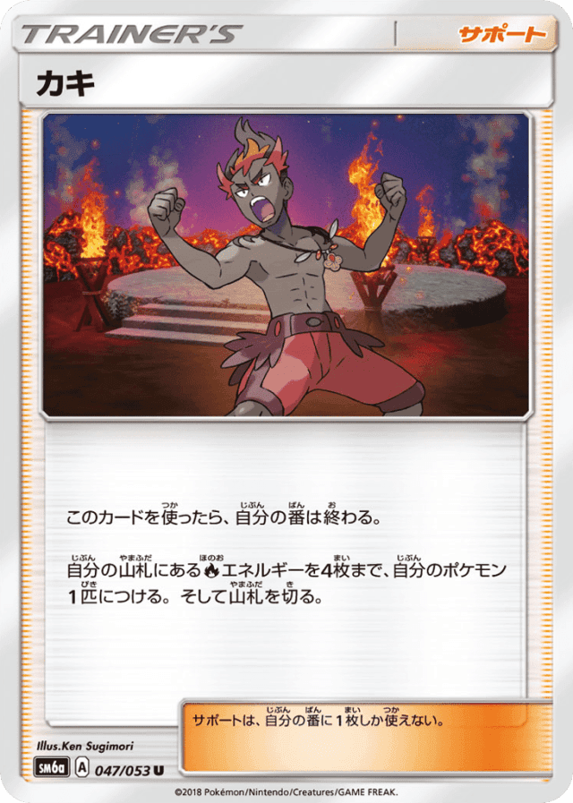 このカードを使ったら、自分の番は終わる。 自分の山札にあるFireエネルギーを4枚まで、自分のポケモン1匹につける。そして山札を切る。 サポートは、自分の番に1枚しか使えない。