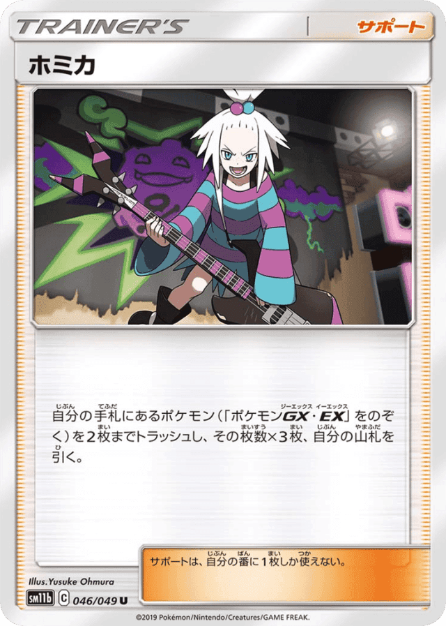 自分の手札にあるポケモン(「ポケモンGX・EX」をのぞく)を2枚までトラッシュし、その枚数×3枚、自分の山札を引く。 サポートは、自分の番に1枚しか使えない。