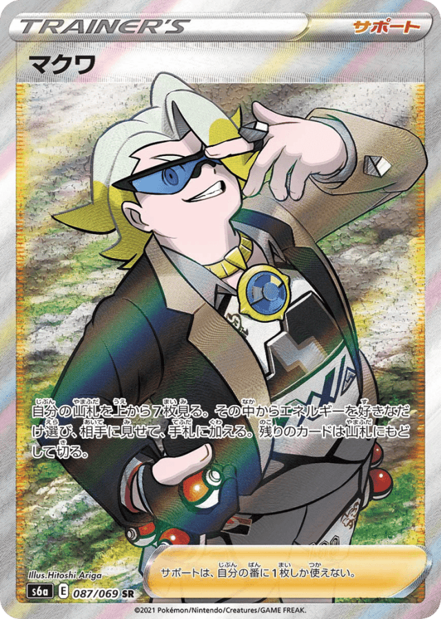 自分の山札を上から7枚見る。その中からエネルギーを好きなだけ選び、相手に見せて、手札に加える。残りのカードは山札にもどして切る。 サポートは、自分の番に1枚しか使えない。