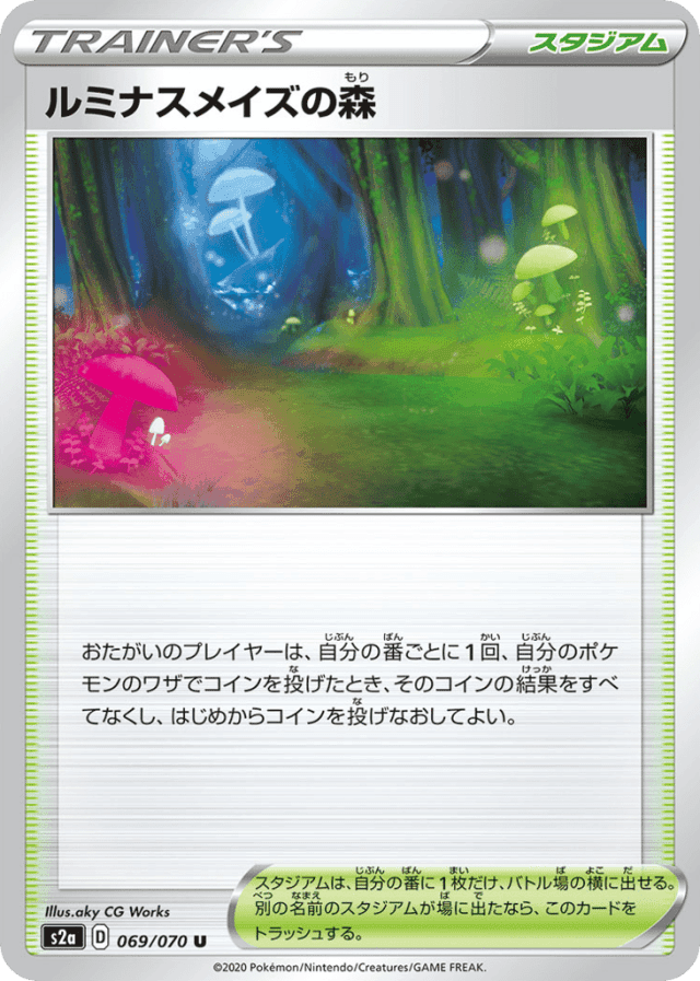 おたがいのプレイヤーは、自分の番ごとに1回、自分のポケモンのワザでコインを投げたとき、そのコインの結果をすべてなくし、はじめからコインを投げなおしてよい。 スタジアムは、自分の番に1枚だけ、バトル場の横に出せる。別の名前のスタジアムが場に出たなら、このカードをトラッシュする。