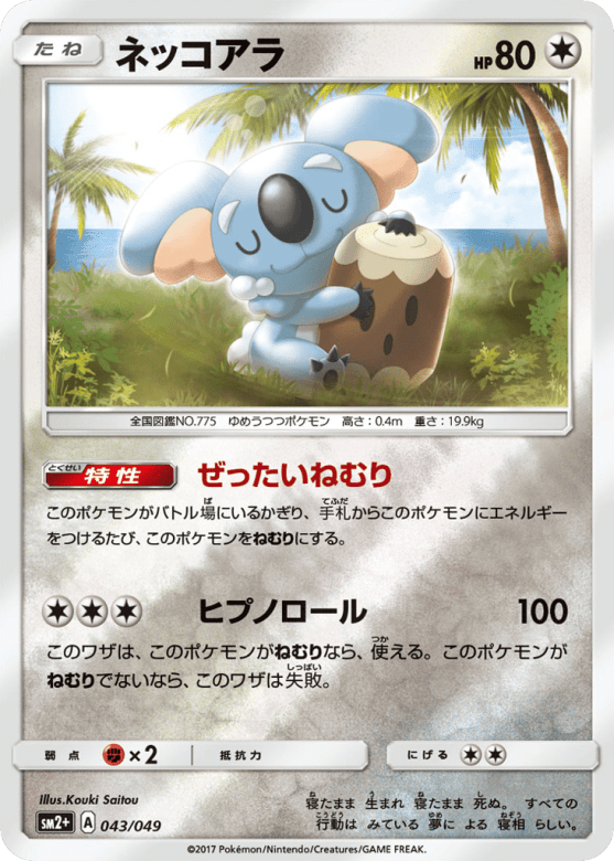 このポケモンがバトル場にいるかぎり、手札からこのポケモンにエネルギーをつけるたび、このポケモンをねむりにする。