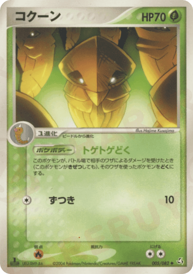 If Kakuna is your Active Pokémon and is damaged by an opponent's attack (even if Kakuna is Knocked Out), the Attacking Pokémon is now Poisoned.
