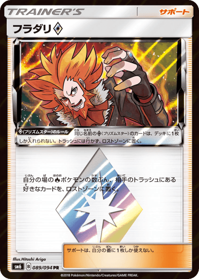 自分の場のFireポケモンの数ぶん、相手のトラッシュにある好きなカードを、ロストゾーンに置く。 サポートは、自分の番に1枚しか使えない。