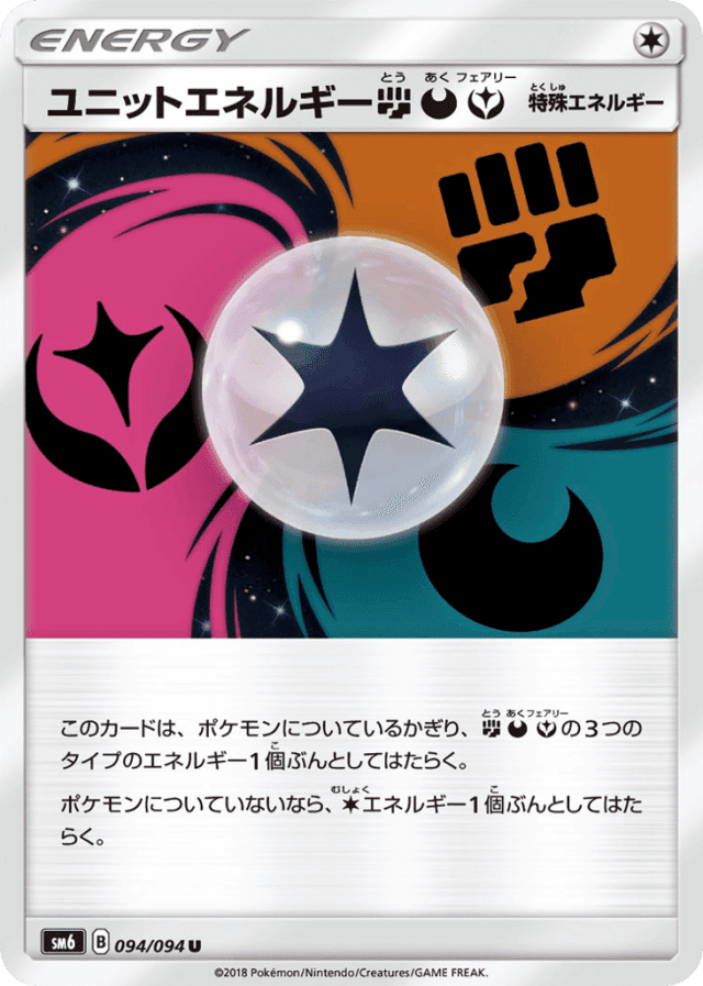 - このカードは、ポケモンについているかぎり、Fightingの3つのタイプのエネルギー1個ぶんとしてはたらく。 — ポケモンについていないなら、Colorlessエネルギー1個ぶんとしてはたらく。