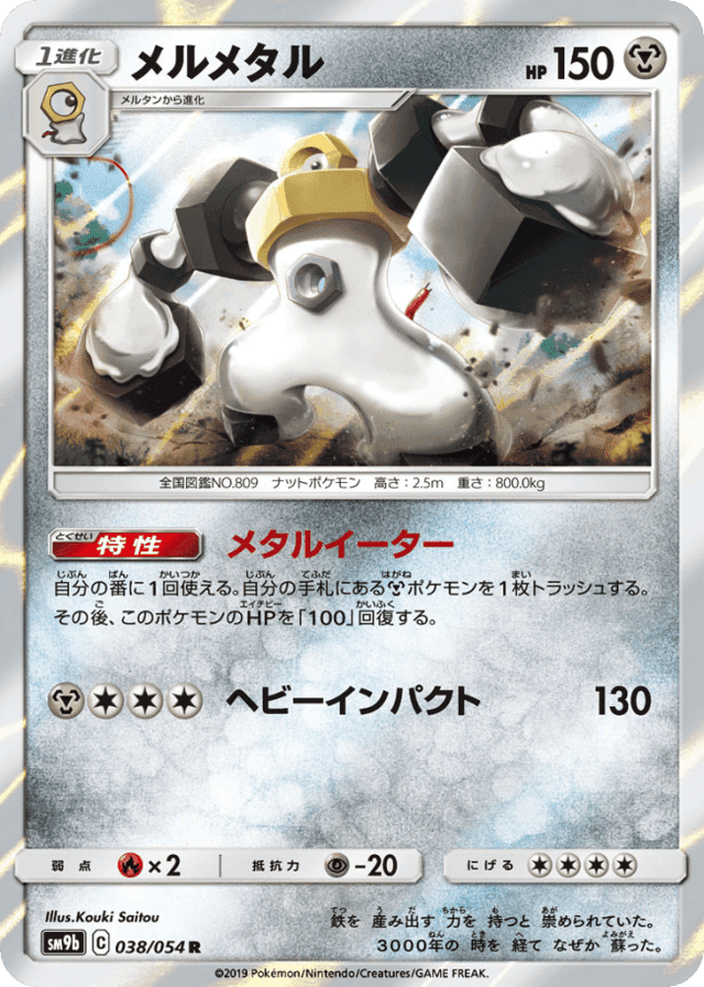 Metal Eater自分の番に1回使える。自分の手札にあるMetalポケモンを1枚トラッシュする。その後、このポケモンのHPを「100」回復する。