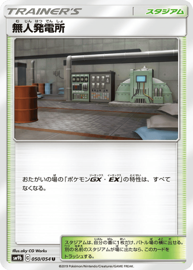 おたがいの場の「ポケモンGX・EX」の特性は、すべてなくなる。 スタジアムは、自分の番に1枚だけ、バトル場の横に出せる。別の名前のスタジアムが場に出たなら、このカードをトラッシュする。