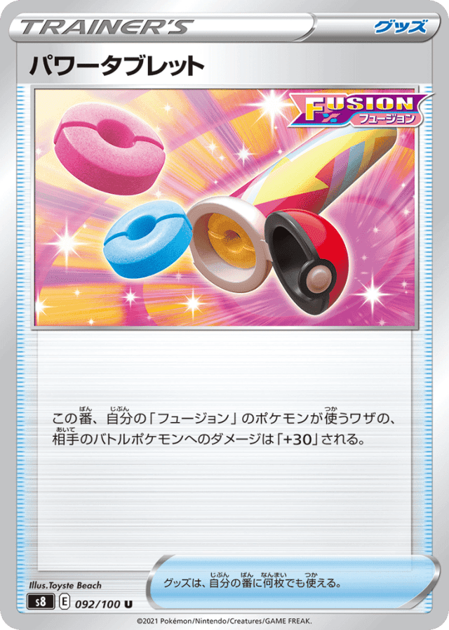 この番、自分の「フュージョン」のポケモンが使うワザの、相手のバトルポケモンへのダメージは「+30」される。 グッズは、自分の番に何枚でも使える。
