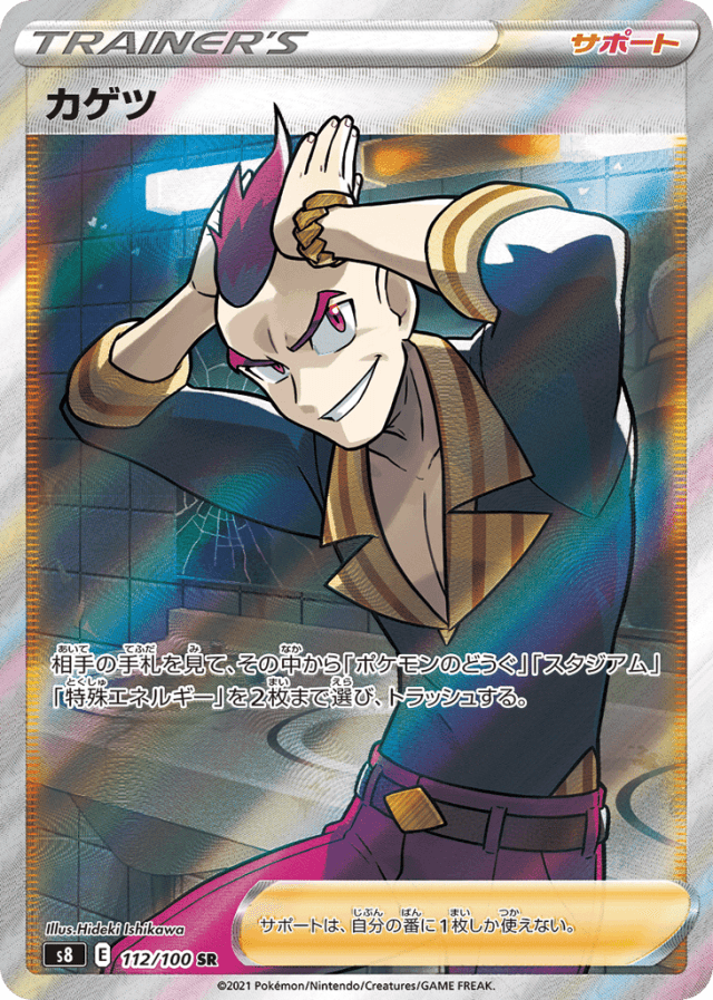 相手の手札を見て、その中から「ポケモンのどうぐ」「スタジアム」「特殊エネルギー」を2枚まで選び、トラッシュする。 サポートは、自分の番に1枚しか使えない。