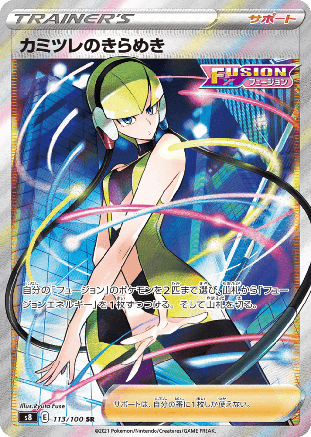 - 自分の「フュージョン」のポケモンを2匹まで選び、山札から「フュージョンエネルギー」を1枚ずつつける。そして山札を切る。 — サポートは、自分の番に1枚しか使えない。