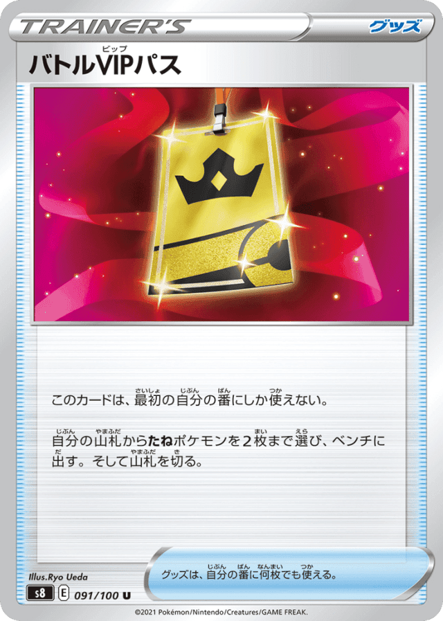 - このカードは、最初の自分の番にしか使えない。 — 自分の山札からたねポケモンを2枚まで選び、ベンチに出す。そして山札を切る。 — グッズは、自分の番に何枚でも使える。
