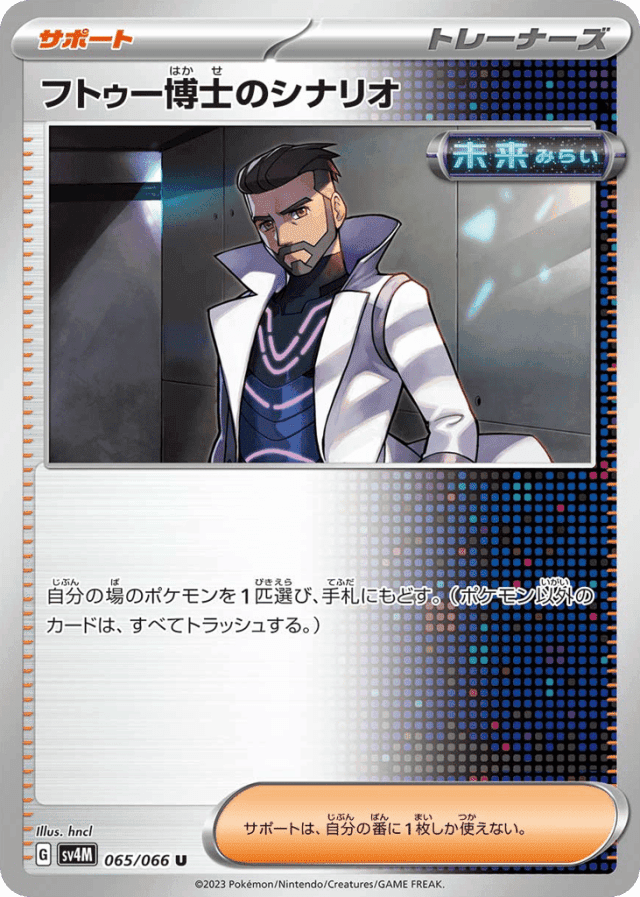 自分の場のポケモンを1匹選び、手札にもどす。(ポケモン以外のカードは、すべてトラッシュする。) サポートは、自分の番に1枚しか使えない。