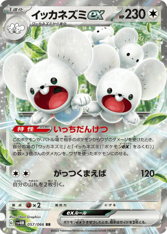 Solidarityこのポケモンが、バトル場で相手のポケモンからワザのダメージを受けたとき、自分の場の「ワッカネズミ」と「イッカネズミ(『ポケモンex』をふくむ)」の数×3個ぶんのダメカンを、ワザを使ったポケモンにのせる。