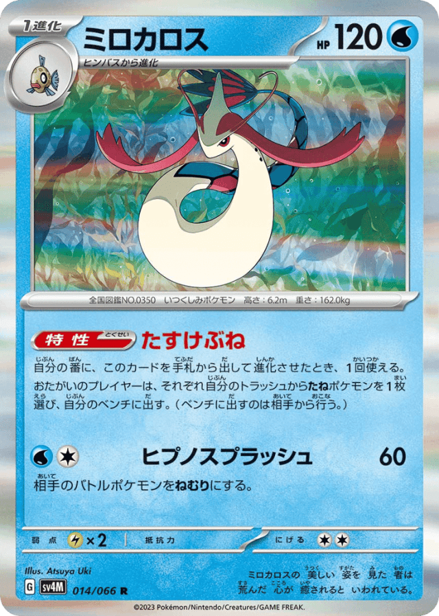 Lifeboat自分の番に、このカードを手札から出して進化させたとき、1回使える。おたがいのプレイヤーは、それぞれ自分のトラッシュからたねポケモンを1枚選び、自分のベンチに出す。(ベンチに出すのは相手から行う。)