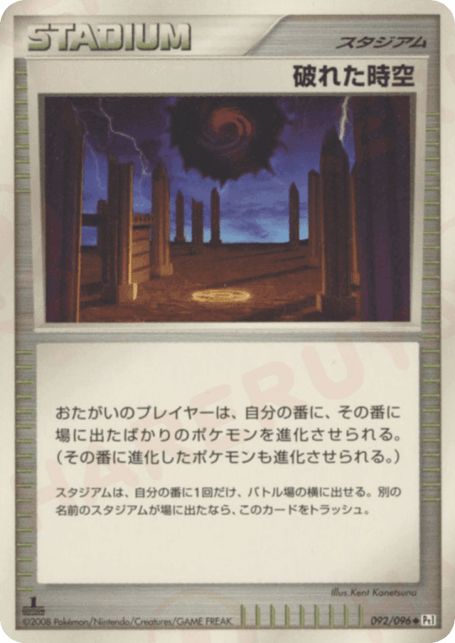 おたがいのプレイヤーは、自分の番に、その番に場に出たばかりのポケモンを進化させられる。(その番に進化したポケモンも進化させられる。) スタジアムは、自分の番に1枚だけ、バトル場の横に出せる。別の名前のスタジアムが場に出たなら、このカードをトラッシュする。
