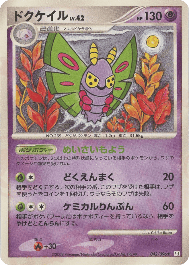 The Defending Pokémon is now Poisoned. If the Defending Pokémon tries to attack during your opponent's next turn, your opponent flips a coin. If tails, that attack does nothing. - ケミカルりんぷん