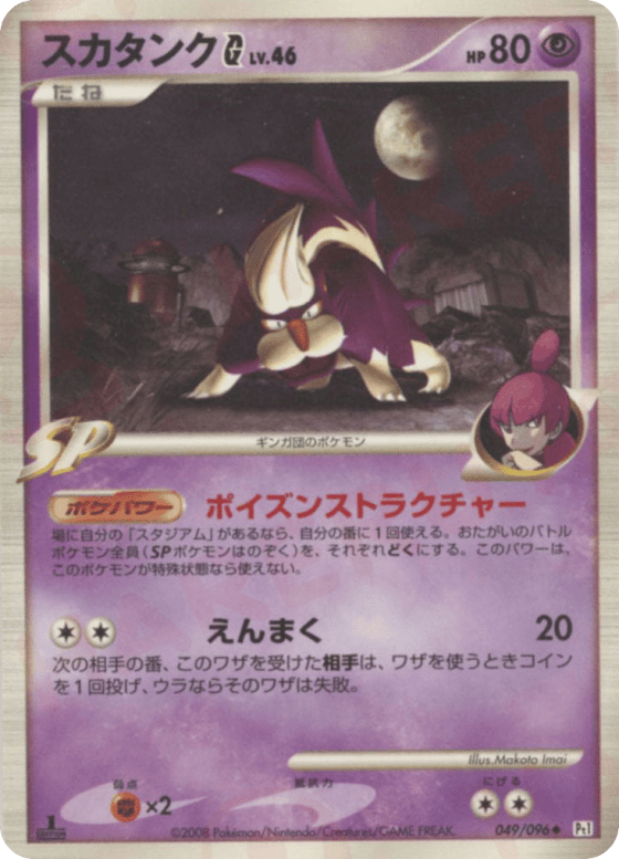 Once during your turn (before your attack), if you have a Stadium card in play, you may use this power. Each Active Pokémon (both yours and your opponent's) (excluding Pokémon SP) is now Poisoned. This power can't be used if Skuntank G is affected by a Special Condition.
