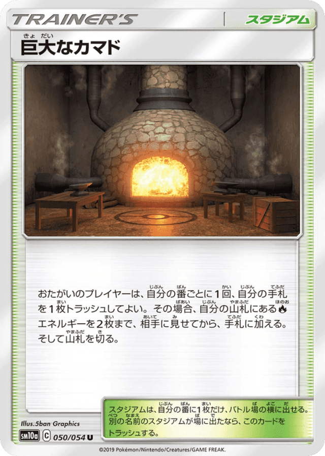おたがいのプレイヤーは、自分の番ごとに1回、自分の手札を1枚トラッシュしてよい。その場合、自分の山札にあるFireエネルギーを2枚まで、相手に見せてから、手札に加える。そして山札を切る。 スタジアムは、自分の番に1枚だけ、バトル場の横に出せる。別の名前のスタジアムが場に出たなら、このカードをトラッシュする。