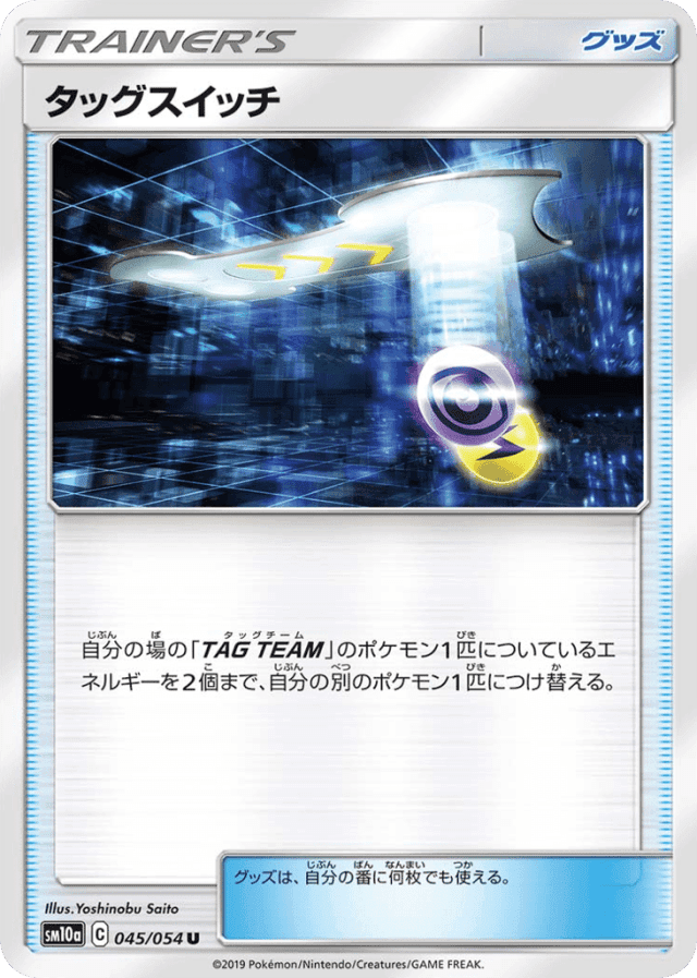 自分の場のTAG TEAMのポケモン1匹についているエネルギーを2個まで、自分の別のポケモン1匹につけ替える。 グッズは、自分の番に何枚でも使える。