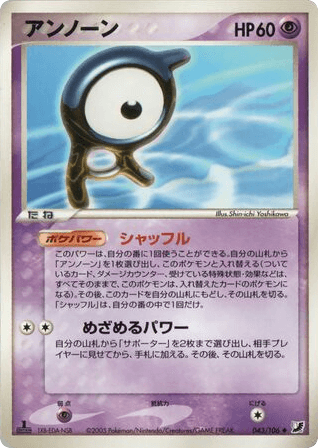 Once during your turn (before your attack), you may search your deck for another Unown and switch it with Unown. (Any cards attached to Unown, damage counters, Special Conditions, and effects on it are now on the new Pokémon.) If you do, put Unown on top of your deck. Shuffle your deck afterward. You can't use more than 1 Shuffle Poké-Power each turn.