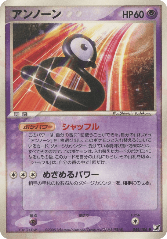 Once during your turn (before your attack), you may search your deck for another Unown and switch it with Unown. (Any cards attached to Unown, damage counters, Special Conditions, and effects on it are now on the new Pokémon.) If you do, put Unown on top of your deck. Shuffle your deck afterward. You can't use more than 1 Shuffle Poké-Power each turn.