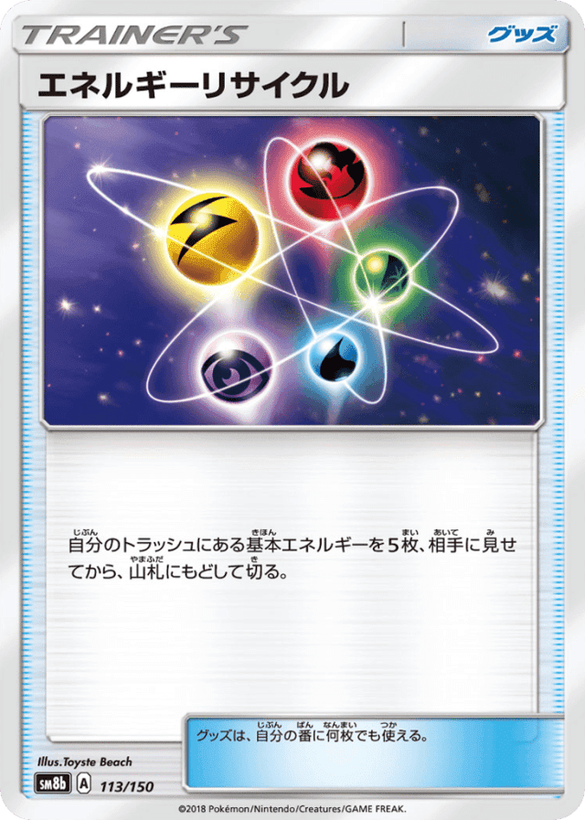 - 自分のトラッシュにある基本エネルギーを5枚、相手に見せてから、山札にもどして切る。
