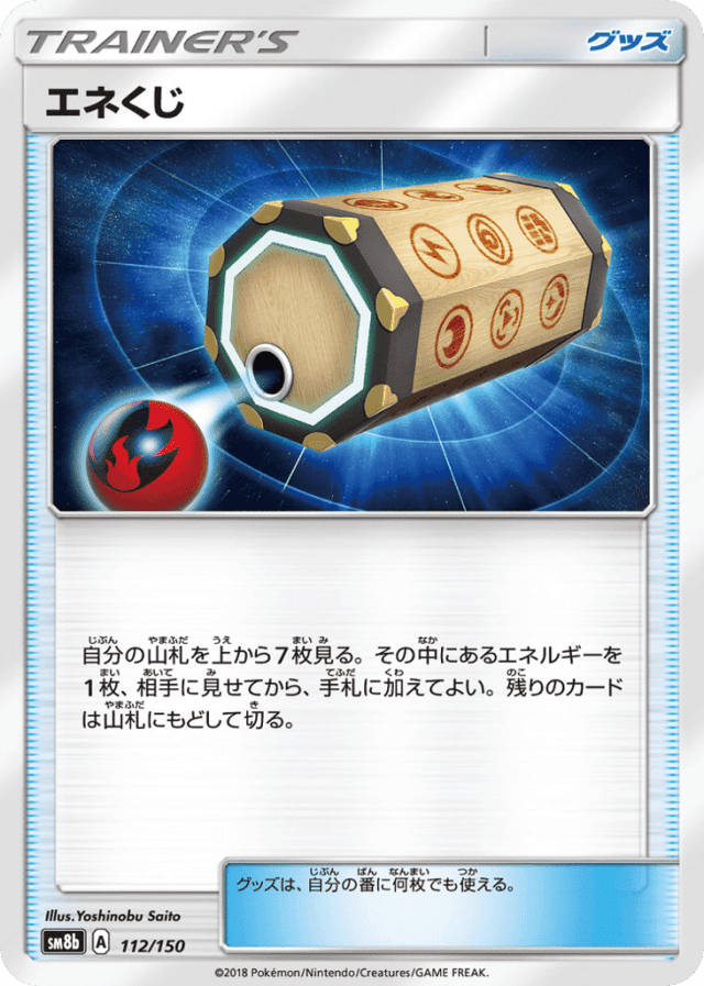 自分の山札を上から7枚見る。その中にあるエネルギーを1枚、相手に見せてから、手札に加えてよい。残りのカードは山札にもどして切る。 グッズは、自分の番に何枚でも使える。