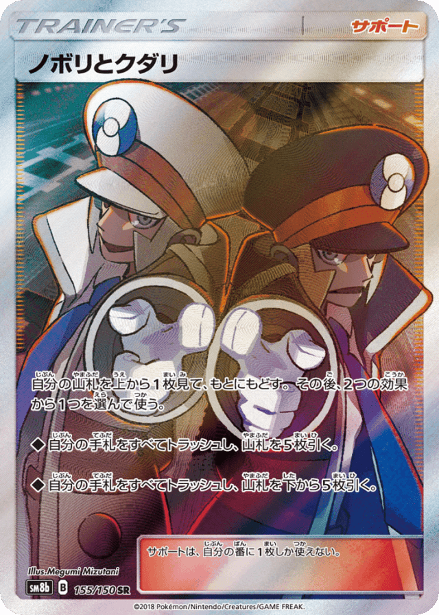 - 自分の山札を上から1枚見て、もとにもどす。その後、2つの効果から1つを選んで使う。 — ◆ 自分の手札をすべてトラッシュし、山札を5枚引く。 — ◆ 自分の手札をすべてトラッシュし、山札を下から5枚引く。 — サポートは、自分の番に1枚しか使えない。