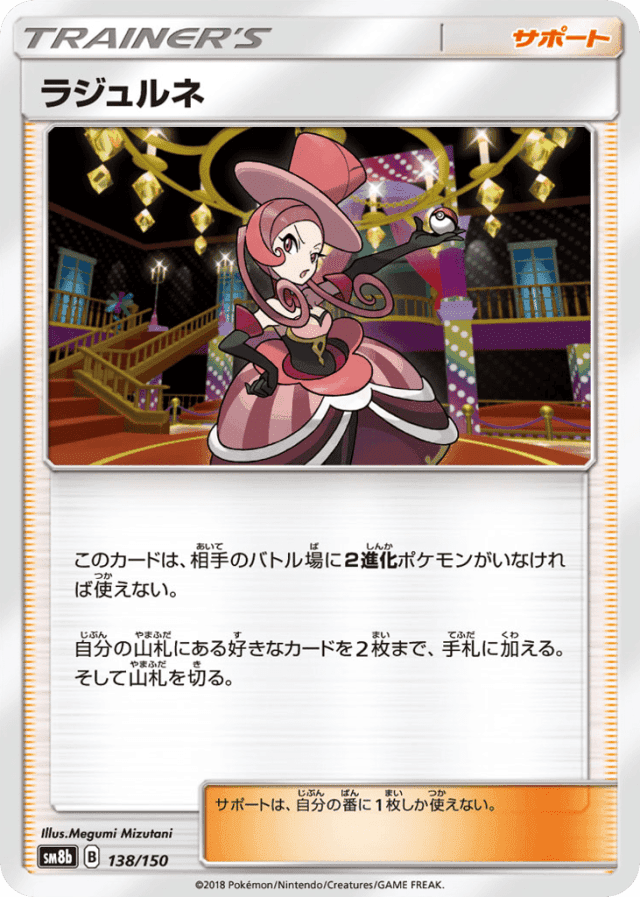 - このカードは、相手のバトル場に2進化ポケモンがいなければ使えない。 — 自分の山札にある好きなカードを2枚まで、手札に加える。そして山札を切る。 — サポートは、自分の番に1枚しか使えない。
