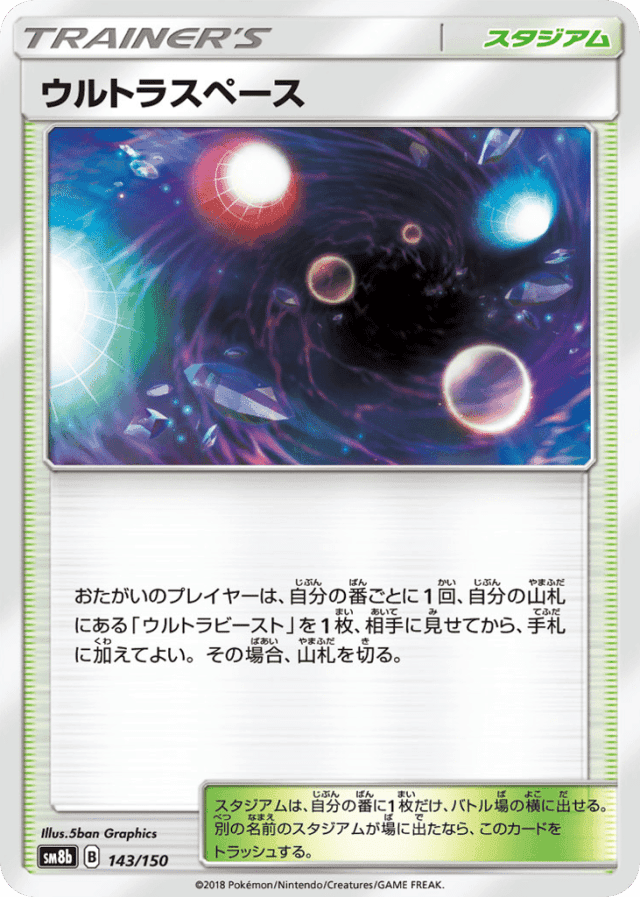おたがいのプレイヤーは、自分の番ごとに1回、自分の山札にある「ウルトラビースト」を1枚、相手に見せてから、手札に加えてよい。その場合、山札を切る。 スタジアムは、自分の番に1枚だけ、バトル場の横に出せる。別の名前のスタジアムが場に出たなら、このカードをトラッシュする。