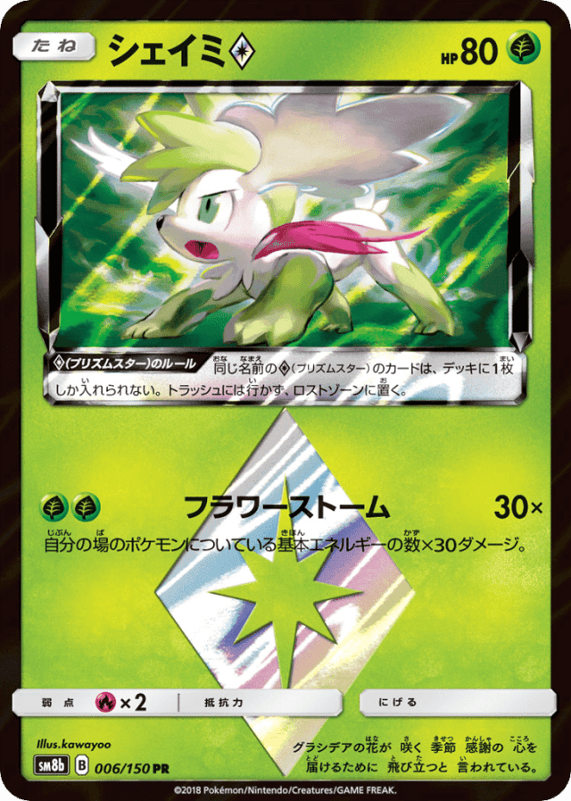 Flower Storm30×Cost: 2自分の場のポケモンについている基本エネルギーの数×30ダメージ。