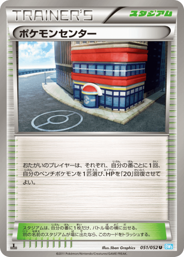 おたがいのプレイヤーは、それぞれ、自分の番ごとに1回、自分のベンチポケモンを1匹選び、HPを「20」回復させてよい。 スタジアムは、自分の番に1枚だけ、バトル場の横に出せる。別の名前のスタジアムが場に出たなら、このカードをトラッシュする。